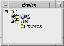 The TixTree widget is based on the TixScrolledHList widget; you can use it to create a collapsible hierarchical structure so that the user can conveniently navigate through a large number of list entries. As shown in figure 4-7, the TixTree puts the little ``+'' and ``-'' icons next to the branches of an HList entry that has descendants. These two icons are knows as the open and close icons, respectively. When the user presses the open icon next to an entry, its immediate children of an entry will be displayed. Conversely, when the user presses the close icon, the entry's children will become hidden.