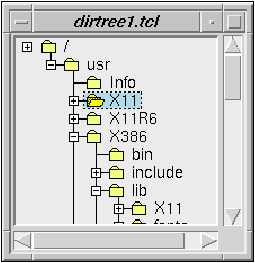 There are two Tix widgets for selecting a directory: TixDirList (figure 5-6 ) and TixDirTree (figure 5-6). Both of them display the directories in a hierarchical format. The display in the TixDirList widget is more compact: it shows only the parent- and child-directories of a particular directory. The TixDirTree widget, on the other hand, can display the whole tree structure of the file system.